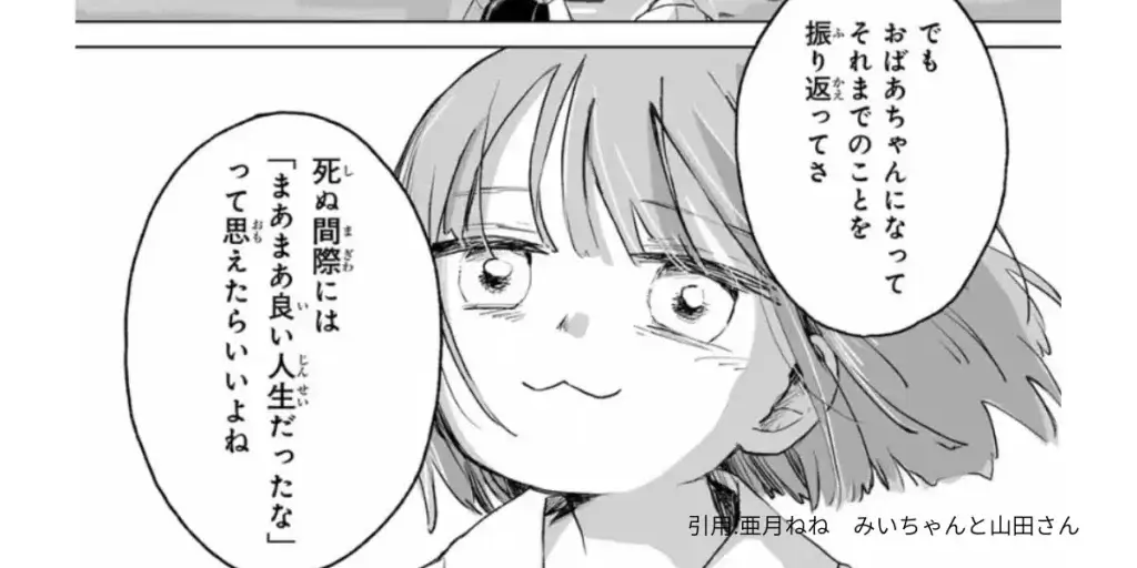 <おばあちゃんになってそれまでのことを振り返ってさ、死ぬ間際にはまあまあ良い人生だったなって思えたらいいよね>